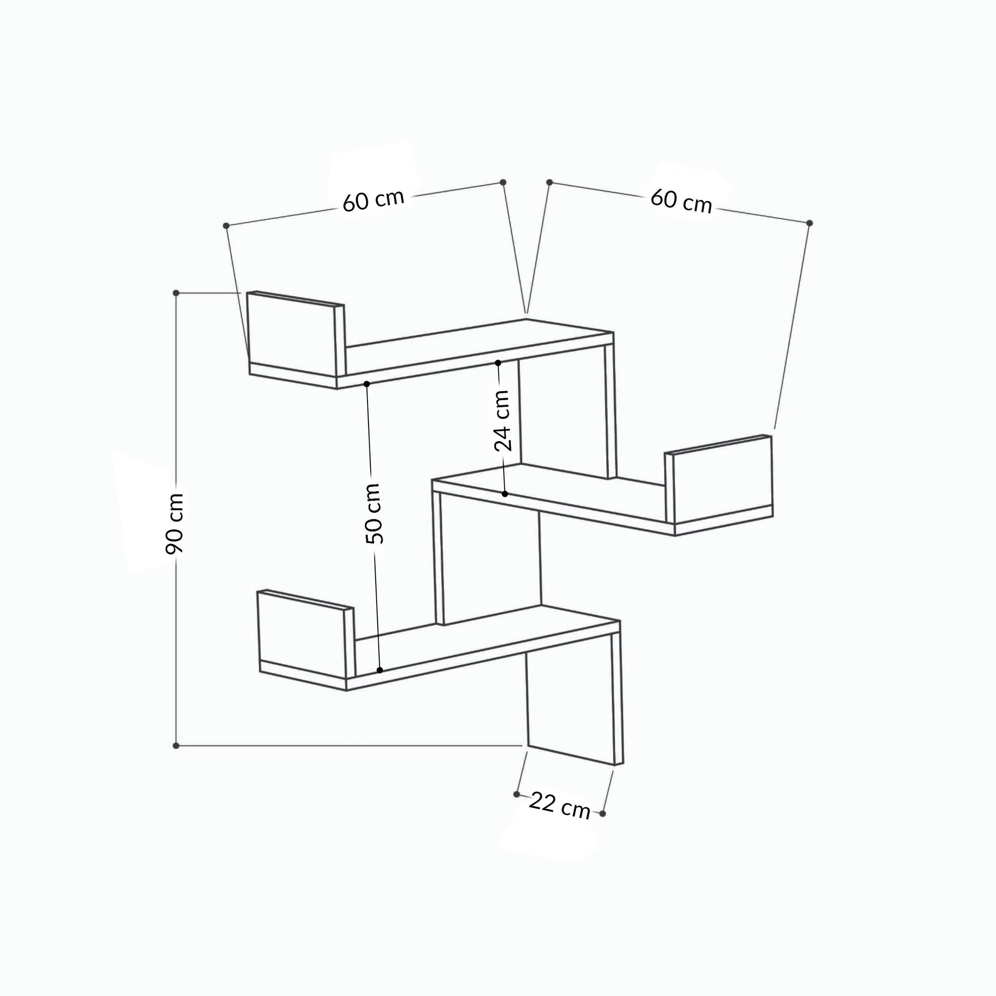Muuda oma kodunurk praktiliseks ja stiilseks Luksa seinanurgariiuliga. See kaasaegne, zigzag-disainiga raamaturiiul sobib ideaalselt väikestesse ruumidesse, pakkudes kolme võrdse suurusega tasandit hoiustamiseks ja esitlemiseks. Mõõtmetega 60 x 60 x 90 cm mahutab iga tasand kuni 9 kg raskust, olles ideaalne raamatute, taimede ja dekoratiivsete esemete jaoks.